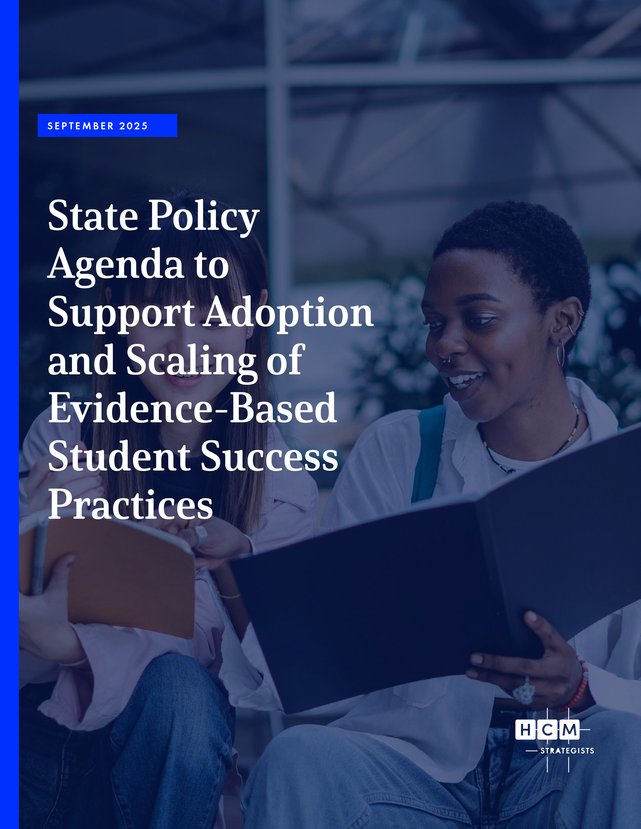 HCM’S newest policy series State Policy Agenda to Support Adoption and Scaling of Evidence-Based Student Success Practices examines state policies that support the scaling of evidence-based student success practices. This brief is the first in a series introducing a state policy agenda designed to expand and sustain evidence-based student success practices that drive completion and economic mobility. The series will outline existing frameworks and highlight policy solutions that enable states to scale these practices, with a focus on finance, affordability, and student supports.